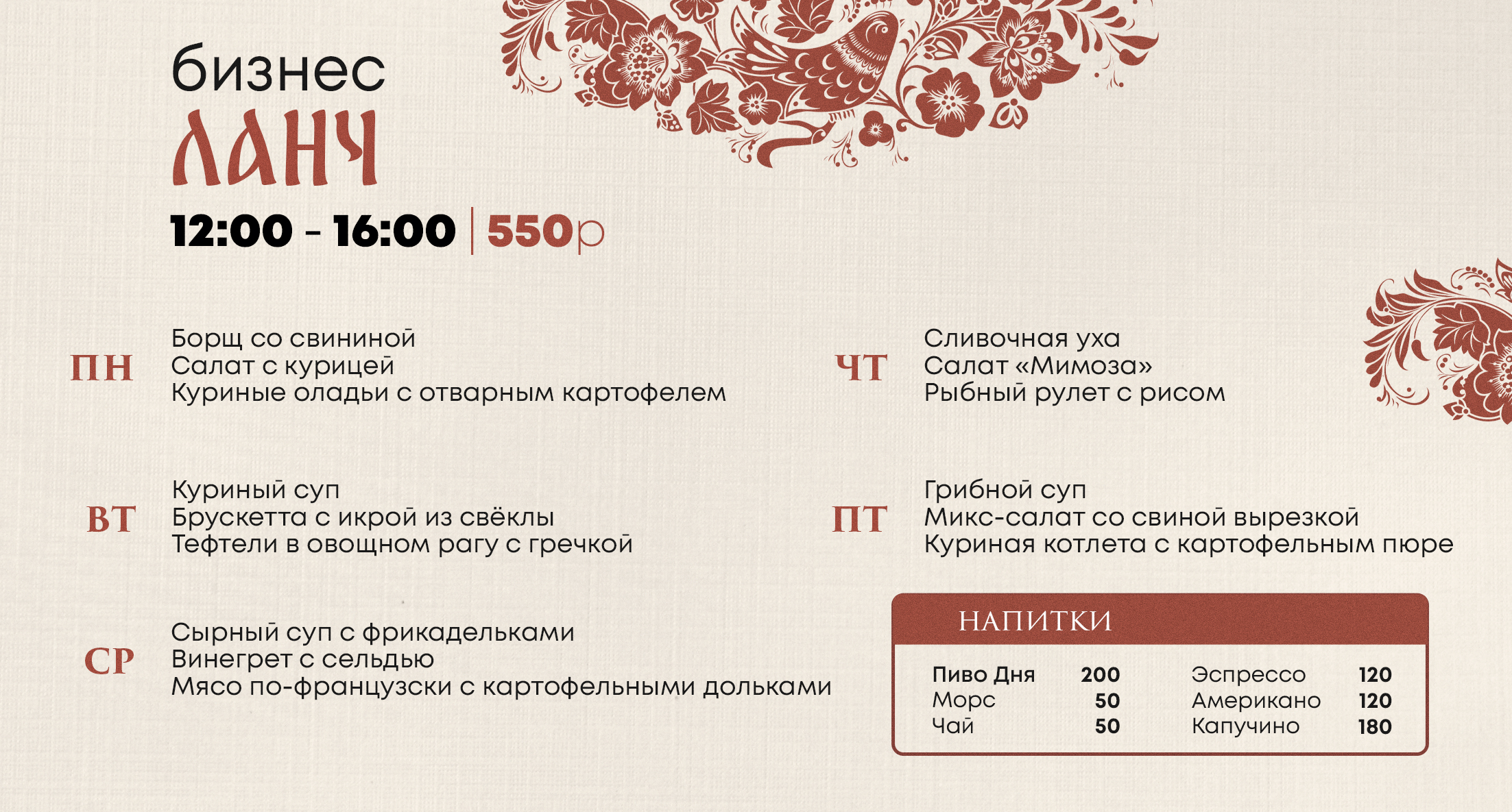 Для наших любимых гостей мы предлагаем огромный выбор импортного и российского пива, вкуснейшие блюда и закуски. По будням готовим самые вкусные бизнес-ланчи для вас.